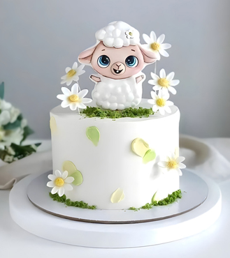 Delicately adorned with daisies, soft moss detailing, and a wide-eyed lamb topper, this cake brings a fresh and whimsical touch to your Eid festivities. Flavors include chocolate, Oreo, strawberry, red velvet, and Neapolitan.