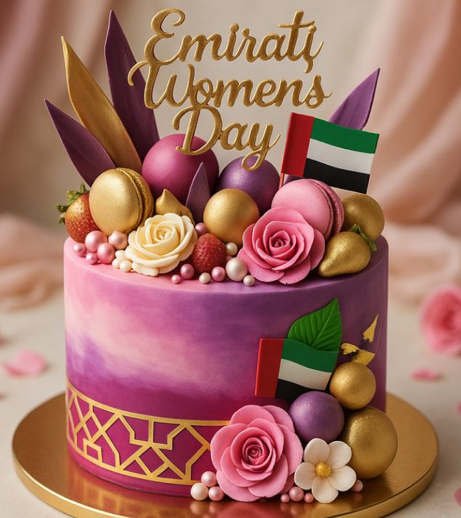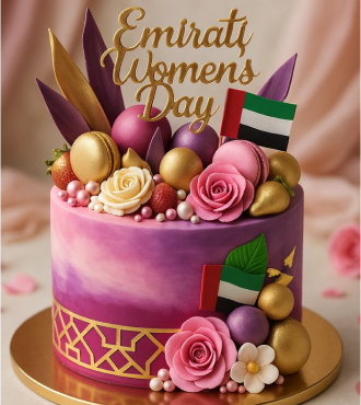 Vivid and bold, this cake features a marbled purple-pink finish, adorned with golden spheres, handcrafted roses, and UAE flag accents. Macarons, berries, and artistic chocolate decorations complete the show-stopping look. Available in chocolate, Oreo, strawberry, red velvet, and Neapolitan flavors