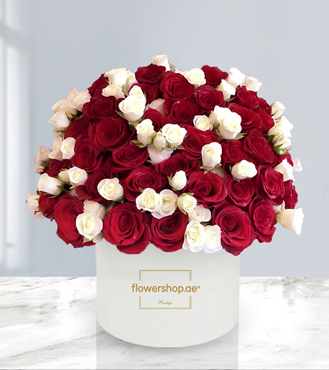 Elevate your floral experience with our Mesmerizing Dream Hatbox. Immerse yourself in a world of elegance as red and white roses intertwine, creating a captivating dance of colors and textures within our iconic white hatbox. This arrangement is a true masterpiece, perfect for expressing your deepest emotions and creating lasting memories.