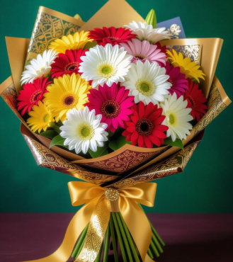 A lively bouquet of gerberas in red, yellow, pink, and white shades, wrapped in elegant gold paper and finished with a satin bow. The vibrant hues symbolize happiness and abundance — making this bouquet an instant mood-lifter and an ideal festive gift.