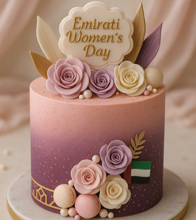 An enchanting ombre cake fading from blush to deep violet, adorned with intricate roses, macarons, and golden leaves. The design is accented with pearls and UAE flag details for a luxurious finish. Available in chocolate, Oreo, strawberry, red velvet, and Neapolitan flavors, it’s perfect for marking special occasions with elegance.
