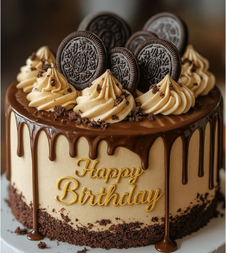 This stunning celebration cake boasts a smooth buttercream finish, glossy chocolate drip, and generous Oreo cookie toppings. Finished with a gold "Happy Birthday" message, it’s available in five crowd-pleasing flavors: chocolate, Oreo, strawberry, red velvet, and Neapolitan.