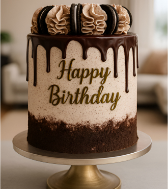 Standing tall and elegant, this show-stopping cake features layers of rich sponge, a chocolate drip, and decadent cookies & cream frosting, crowned with swirls and whole Oreos. The gold “Happy Birthday” topper adds a touch of luxury to any birthday celebration.