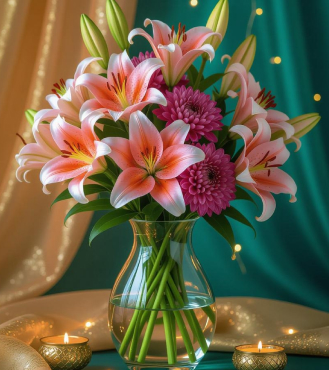 Soft pink lilies and deep mauve chrysanthemums come together in a transparent vase, creating a breathtaking fusion of grace and femininity. The arrangement glows with delicate fragrance and texture, making it an elegant way to share love, gratitude, or celebration.