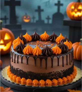 Rich chocolate sponge layers are enveloped in smooth cocoa frosting with striking orange and black swirls that capture the Halloween spirit. The deep chocolate flavour and creamy texture make it a deliciously spooky centerpiece for any festive table.