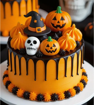Layers of moist sponge frosted in vivid orange and topped with a cascade of dark chocolate drip create the perfect Halloween look. Decorated with pumpkins, skulls, and witch hat toppers, it’s a sweet treat that captures spooky fun and seasonal flair.