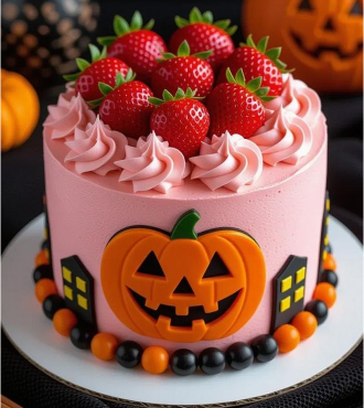 Soft pink frosting pairs with juicy strawberries and a cheerful pumpkin face for a fruity Halloween twist. The combination of sweet berry freshness and creamy texture brings a light, joyful charm to your festive table.