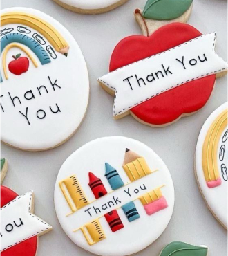 Bursting with color and creativity, these cookies feature delightful designs like rainbows, crayons, pencils, and apples, each carrying a cheerful "Thank You" message. They make a thoughtful and tasty gift for teachers or school staff. Choose between a 10-piece option with five designed gingerbread cookies and five plain cookies, or a 20-piece option with ten designed gingerbread cookies and ten plain cookies.
