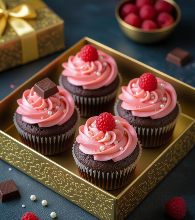 Rich chocolate cupcakes topped with creamy pink frosting, fresh raspberries, pearls, and a hint of gold dust — offering a refreshing burst of berry brightness balanced by deep cocoa indulgence, perfect for moments of sweet celebration.