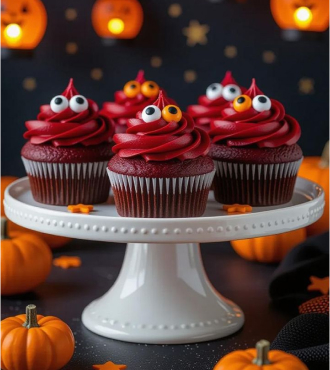 Soft red velvet cupcakes topped with glossy red frosting and candy eyes that seem to follow you with every move. Each bite delivers a perfect balance of cocoa richness and buttery sweetness, making them irresistibly spooky and delicious.
