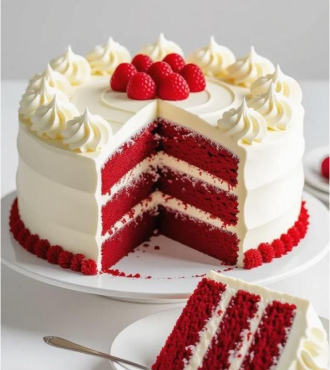 Indulge in the symphony of flavors with this moist red velvet cake layered with velvety cream cheese frosting. Its striking red layers are enhanced with delicate swirls of frosting and topped with a sprinkle of red velvet crumbs. Perfect for elevating any occasion, this cake will bring a touch of sophistication to your celebrations.