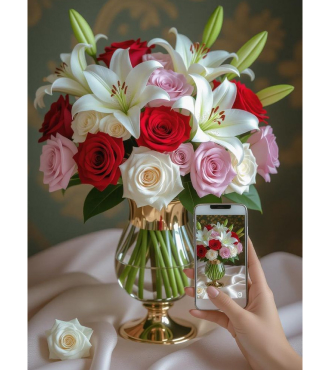 An opulent combination of vibrant roses and elegant lilies arranged in a transparent vase. This luxurious creation blends soft and bold hues, making it a perfect expression of love and admiration, easily found at flowershop. Depending on availability, components such as vase or hatbox color and design, may vary.