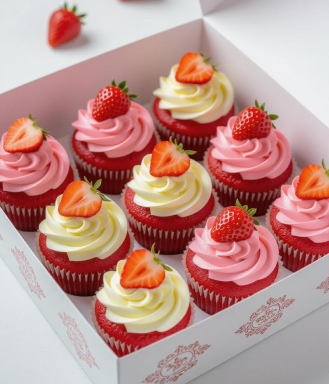 Bright, beautiful, and bursting with flavor! These red velvet cupcakes are topped with swirls of creamy pink and white frosting and finished with fresh strawberry halves. Perfect for birthdays, parties, or simply to satisfy your sweet cravings in style.