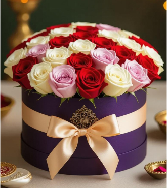 A charming hatbox overflowing with roses in red, white, and soft pink tones — a stunning display of elegance and warmth. The perfect blend of passion, admiration, and tenderness, each bloom adds a whisper of romance, making it a thoughtful gift for any special moment.