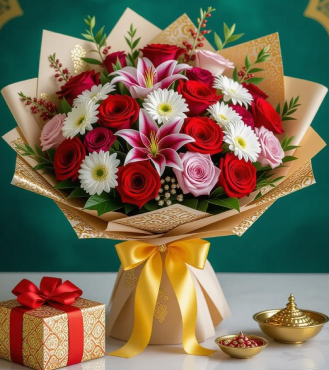 A beautifully balanced bouquet that blends red roses, pink lilies, and cheerful gerberas into one vibrant creation. Each bloom complements the other in tone and texture, crafting a sophisticated arrangement that celebrates life, love, and joy with every delicate petal.