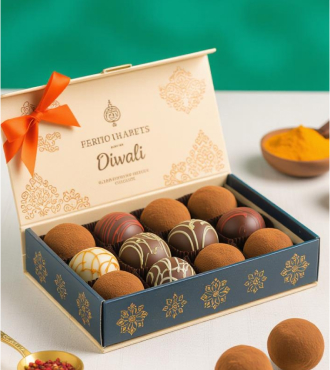 A delicate assortment of truffles in milk, dark, and white chocolate, dusted, drizzled, and perfectly molded for a luxurious finish. Each piece captures the joy and elegance of Diwali gifting. Box design may vary based on availability.
