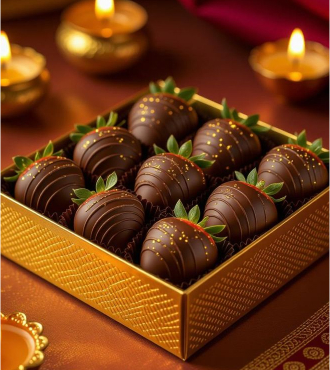 A box of decadence where hand-dipped dark chocolate strawberries shimmer with golden sprinkles. Box design may vary based on availability.