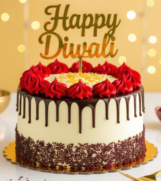 Redvelvet layers enhanced by a striking red-and-gold contrast, with a smooth ganache drip and bright red frosting peaks.