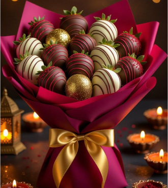 A show-stopping bouquet bursting with chocolate-draped strawberries in white, milk, and dark tones, paired with golden accents. Wrapped in deep red with a rich satin bow, it symbolizes love, light, and the warmth of shared celebrations.