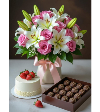 An elegant gift of fresh flowers paired with indulgent treats, perfect for making any celebration unforgettable. Complete with a delicious cake and dipped strawberries, this set blends beauty and sweetness in one, easily arranged through flowers delivery Abu Dhabi.