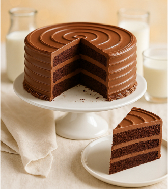 A timeless layered dessert featuring rich chocolate sponge and smooth frosting, designed with elegant swirl patterns. This cake is a go-to for chocolate lovers.