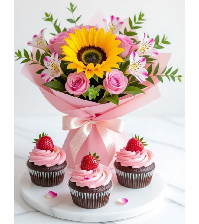 A cheerful and elegant gift set, perfect for brightening someone's day. It includes sunflowers, pink roses, alstroemeria, ruscus, parvifolia, and a rich chocolate cake, easily found with order flowers Dubai.