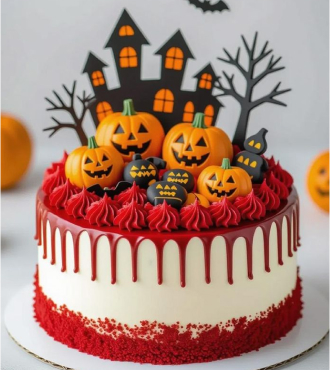 A red velvet creation layered with creamy frosting and dripping scarlet glaze, crowned with a haunted house, bats, and cheerful pumpkins. Each slice brings the perfect blend of soft texture and festive Halloween spirit, ideal for gatherings filled with sweet chills and laughter.