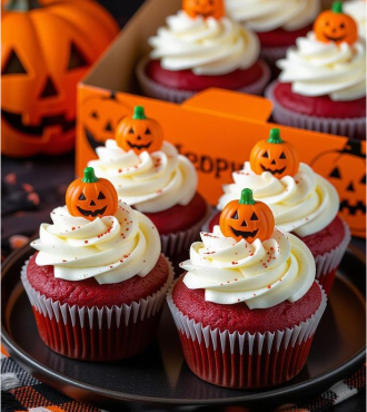 Moist red velvet cupcakes topped with creamy white frosting and mini pumpkin toppers. Their soft texture and balanced sweetness make them a delightful Halloween favorite for kids and adults alike.