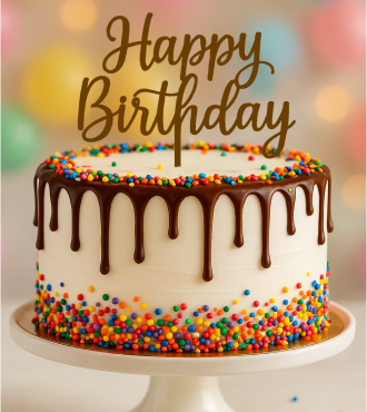 Bright, bold, and bursting with joy, this festive cake is covered in rainbow sprinkles, chocolate ganache drips, and topped with colorful candles—perfect for the ultimate birthday celebration. Available in five delicious flavors to suit every guest’s sweet tooth.