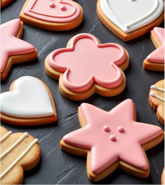 Delicate and delightful, these pink and white cookies come in charming heart, star, and flower shapes, each hand-decorated with elegant icing. Their soft hues and smooth finish make them ideal for romantic celebrations or thoughtful gifting.
