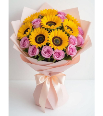 A beautiful combination of sunflowers and soft pink roses, wrapped in pastel pink paper and tied with a satin ribbon. This bouquet offers a cheerful, uplifting vibe, perfect for someone who brings warmth and light into your life. A fresh, delightful gift that will surely brighten anyone's day, easily found through send flowers Dubai. Depending on availability, components such as vase color and design, may vary.