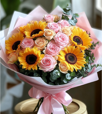 Bright sunflowers paired with soft blush roses and delicate greenery make this hand-tied bouquet a cheerful display of affection. Wrapped in pastel pink, it radiates joy and warmth for any special moment.