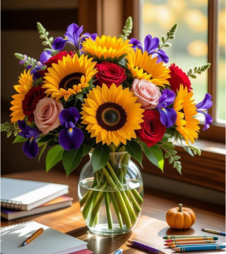 Golden sunflowers shine alongside red roses, blush pink roses, and deep purple accents for a warm and inspiring arrangement. Displayed in a transparent vase, it brightens any desk or classroom while celebrating optimism and growth.