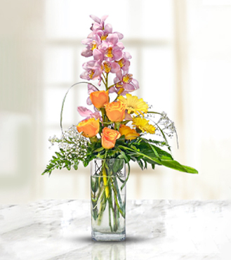 Deliver smiles embellished with casual elegance. A truly sophisticated arrangement of cymbidium orchids, roses, and lovely fillers, perfectly arranged to create the ideal tabletop surprise for when they get home.