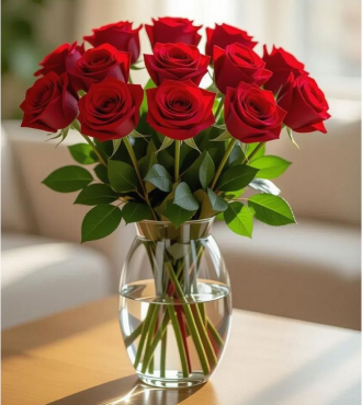 A graceful cluster of red roses presented in a smaller transparent vase, this arrangement exudes classic charm and elegance. Ideal for intimate gestures, it beautifully conveys admiration and heartfelt affection in a timeless way, available with flowers Dubai delivery. Depending on availability, components such as vase color and design, may vary.