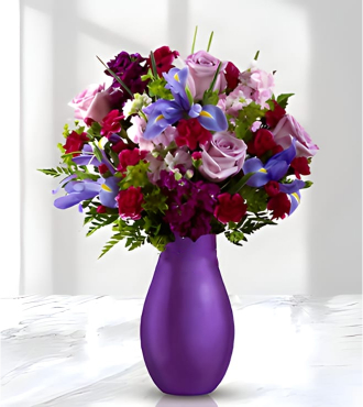 The Together at Twilight Bouquet is a breathtaking floral arrangement that is sure to impress. With its stunning combination of purple roses, pink and purple mathiolas, and fresh fillers, this bouquet is elegantly accented inside a sophisticated purple vase, making it the perfect gift for any occasion. Whether you're celebrating an anniversary, birthday, or simply looking to show someone how much you care, this bouquet is sure to make a lasting impression.