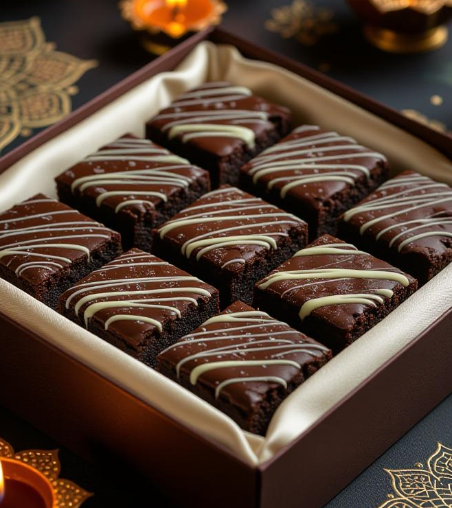 Delicate chocolate brownies topped with smooth dark and white chocolate patterns, creating a visually stunning and flavour-rich combination. Every piece melts with layered textures of cocoa and cream.