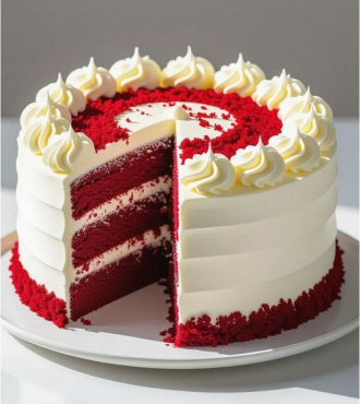 A luxurious red velvet cake that's as beautiful as it is delicious. The cake is layered with creamy frosting that perfectly complements the rich, moist texture of the velvet cake, all topped with a swirl of frosting and decorative red velvet crumbs. Ideal for anniversaries, birthdays, or any moment that deserves to be memorable.
