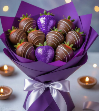 Rich chocolate-dipped strawberries come together in a regal purple wrapping, highlighted by a glittering berry centerpiece. The smooth cocoa coating and elegant drizzle make every bite a luxurious moment of sweetness, perfect for gifting or celebrating in style.