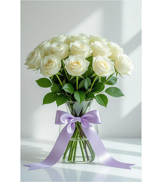 A classic arrangement of white roses beautifully placed in a transparent vase and tied with a satin ribbon. The pristine ivory blooms radiate elegance and purity, making this bouquet perfect for refined occasions and thoughtful gestures, easily ordered when you send flowers in Dubai. Depending on availability, components such as vase or hatbox color and design, may vary.