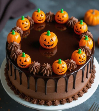 Layers of moist chocolate sponge meet glossy ganache and fluffy cocoa frosting, topped with a ring of playful pumpkin toppers. Each bite bursts with rich chocolate indulgence, making it a delightful pick for Halloween celebrations filled with warmth and fun.