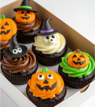Rich chocolate cupcakes topped with velvety frosting and handcrafted pumpkin and witch hat toppers. Each cupcake captures the whimsical side of Halloween while offering a deep, cocoa-rich flavour that everyone will love. Box design may vary based on availability.