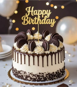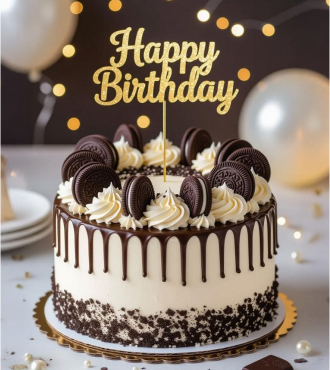 This cookies-and-cream delight features layers of cake frosted with cream, finished with a rich chocolate drip, and topped generously with Oreo cookies. A birthday favourite for cookie lovers, available in five indulgent flavors including chocolate, Oreo, strawberry, red velvet, and Neapolitan.